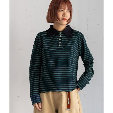配色の衿がポイントのプルオーバートップス。衿端・袖口・裾はメロー始末で軽やかに仕上げ、並んだボタンがさりげないアクセントになっています。無地は柔らかな肌触りで伸縮性のあるリブ素材、ボーダーは程よい厚みのフライス生地を使用。1枚着としてはもちろん、レイヤードのインナーとしても活躍する、普段使いしやすいアイテムです。