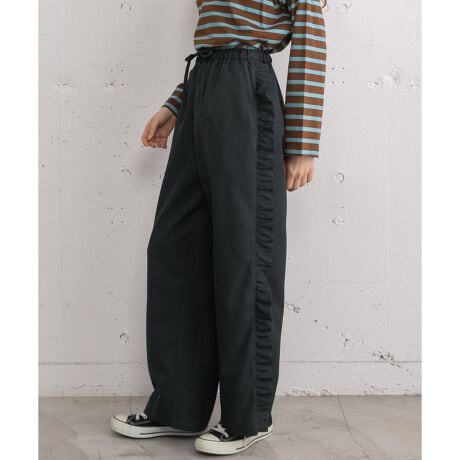 きれいめ素材で仕立てたフルレングスパンツ。サイドのフリルディテールがさりげなく大人ガーリーなアイテム。ストンと落ちるストレートシルエットで、甘すぎない可愛さを添えてくれます。ウエストはぐるりゴムでストレスフリーな履き心地。内紐でフィット感を調節していただけます。両サイドポケット付き。