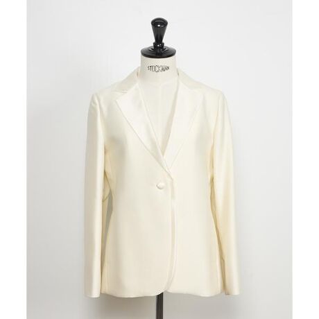 ■デザインラペルが取り外しのシルクオーガンジーで切り替えられたテーラードカラー仕様がモードなタキシードジャケット。上品な艶のあるシルクウール素材を使用しており、高級感のある仕上がりです。衿を取り外すとすっきりとしたカッティングのVネックノーカラージャケット。少し長めの着丈はメンズライクな印象を与えつつ、さりげない女性らしさを演出。オフィスからオケージョンシーンまで幅広く活躍してくれるアイテムです。■素材シルクとウールを交織させ、適度なハリ感が出る様に織り上げた、しなやかさと上品な艶のあるツイル生地です。シルクの持つ光沢と発色性の良さに加え、ウールブレンドに程よい肉感が特徴的です。ハリ感があり、美しく上品なシルエットです。・裏地あり・替衿部分取り外し可■サンプル撮影商品画像の商品はサンプルです。実際の商品とはサイズや色味、素材、デザイン等の仕様が若干変更になる場合がございます。
