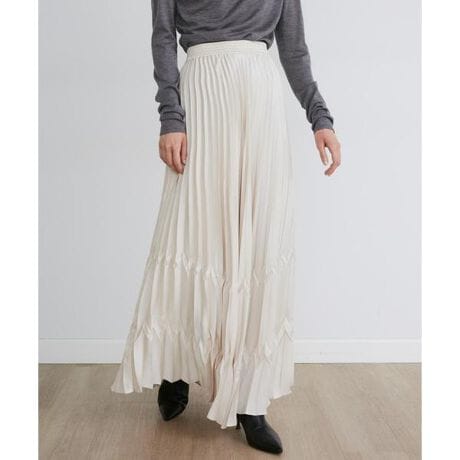美しいドレープとやわらかい肌触り、しなやかな風合いが特徴のプリーツスカート。存在感のある表情になるよう型を作り、プリーツのピッチにもこだわったオリジナルデザインです。ウエスト部分はスッキリ見えつつ、裾に向かって女性らしく柔らかなシルエットと動きを出しました。シンプルなトップスを合わせ、スカートを主役にした華やかなコーディネートがおすすめです。・裏地なし・ペチコートあり・ウエストゴム仕様■サンプル撮影商品■こちらの商品はサンプルでの撮影となっております。実際の商品とは、サイズや色味、素材、デザイン等の仕様が若干変更になる場合がございます。