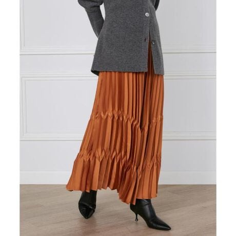 美しいドレープとやわらかい肌触り、しなやかな風合いが特徴のプリーツスカート。存在感のある表情になるよう型を作り、プリーツのピッチにもこだわったオリジナルデザインです。ウエスト部分はスッキリ見えつつ、裾に向かって女性らしく柔らかなシルエットと動きを出しました。シンプルなトップスを合わせ、スカートを主役にした華やかなコーディネートがおすすめです。・裏地なし・ペチコートあり・ウエストゴム仕様■サンプル撮影商品■こちらの商品はサンプルでの撮影となっております。実際の商品とは、サイズや色味、素材、デザイン等の仕様が若干変更になる場合がございます。