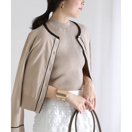 3色展開のうち、ベージュ(027)のカーディガンは配色パイピングがさりげないアクセントになります。