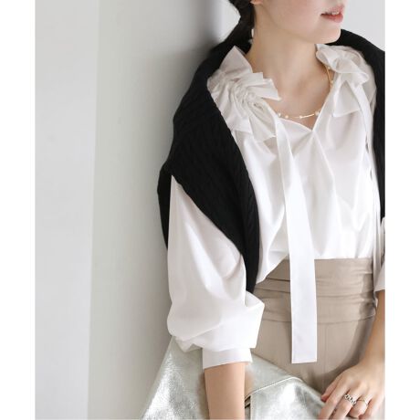 フリルカラーが顔まわりを華やかに演出してくれるブラウス。