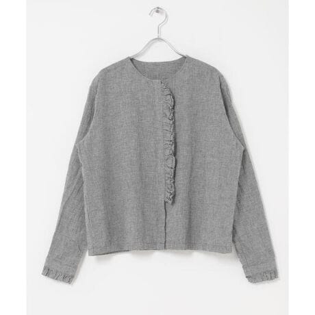 洗い加工によるくったりとした風合いが魅力的。しわが気になりにくく、ノンアイロンで着られる気軽さが嬉しいです。着やすい素材感で夏まで長く活躍が期待できます。前立てのフリルは片方だけなので甘くなりず、袖口にもさり気なく施されたデザイン。端は断ち切り始末にして軽く仕上げました。1枚で存在感を放ちベストやカーディガン・サロペットにも好相性なアイテム。OFFはオケージョンシーンでも着用いただけそうです。