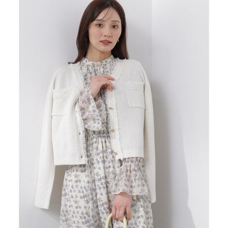 しっかりとした透かし編みで仕上げた大人フェミニンなニットジャケット。ラメ糸が入っているので華やかな印象に見せてくれます。ワンピースはもちろん、デニムパンツと合わせてカジュアルダウンするのもおすすめです。
