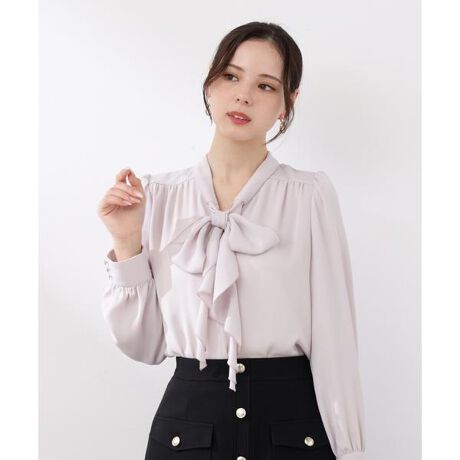 トレンドのラッフルをリボンタイにした華やかブラウス。顔まわりを柔らかい印象に見せてくれるラッフルリボンが映えるデザインは、オフィスシーンからデイリーまでおすすめ。肩のギャザー、カフスの飾り釦もアクセントになっています。パンツ・スカートはもちろん、スーツスタイルにも着回せます。