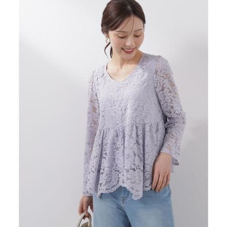 オリジナルのレース柄を使用した上品なペプラムブラウス。旬のヘムラインとオリジナルのレース柄でキレイな仕上がりに。後ろウエストはゴム仕様で動きやすく、ゆとりのあるシルエットなので着やすくなっています。