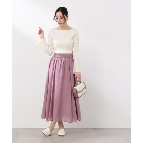 程よい透け感が魅力のギャザースカート。シンプルながらも、上品なゴールドカラーチェーンベルトがクラシックな雰囲気を叶えてくれます。後ろウエストはゴム仕様で動きやすく、はき心地の良さもポイント。ニットやブラウスはもちろん、カットソー合わせでもカジュアルになりすぎず、オンにもオフシーンにも着回せます。