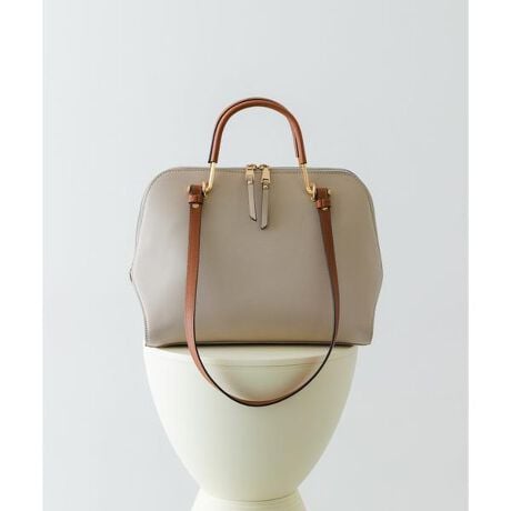 丸みのあるスクエアフォルムと、バイカラーのハンドルがデザインのアクセントになるハンドバッグ。