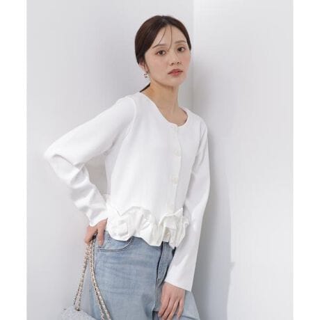 裾まわりの立体的なバルーンフリルが着映えるニット。まるでホイップクリームを絞ったようなディテールがアクセントになります。詰まりすぎない襟ぐりで、抜け感をプラス。釦を留めてプルオーバー風に着こなすのがおすすめです。