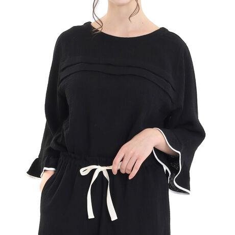 胸のラインをさりげなくカバーしてくれる横段に入れたタックと裾へと広がるAラインが腰回りをカバーしてくれる、リラックス感のあるセットアップ。