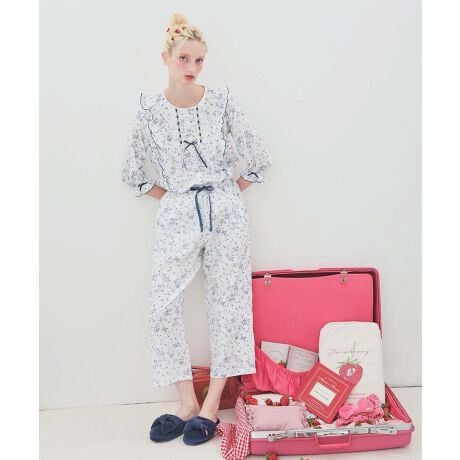 胸元にあしらったレースがポイントの7分袖パジャマ。