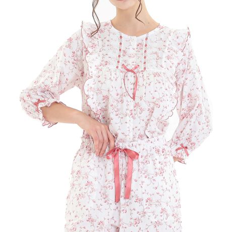 胸元にあしらったレースがポイントの7分袖パジャマ。