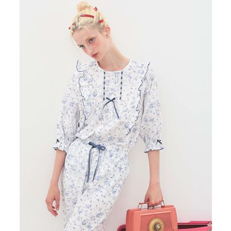 胸元にあしらったレースがポイントの7分袖パジャマ。