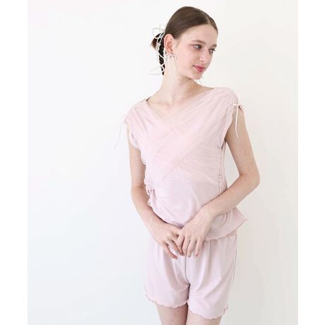フレンチスリーブとショートパンツのセットアップで、肩を少し落としてオフショルダーのように着ることもでき、2スタイルの着方が楽しめます。