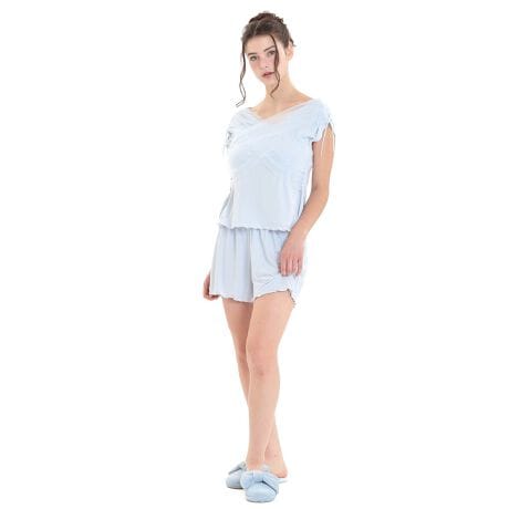 フレンチスリーブとショートパンツのセットアップで、肩を少し落としてオフショルダーのように着ることもでき、2スタイルの着方が楽しめます。