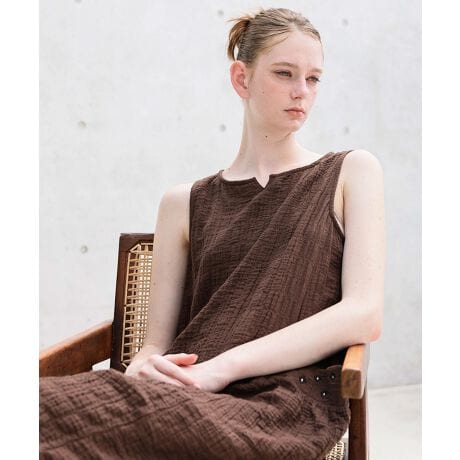 リラクシーなAラインシルエットのノースリーブワンピース。
