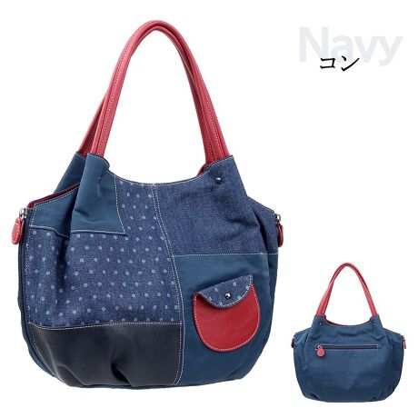 本体に軽量はっ水加工ナイロンにデニム,合皮をパッチワークした個性的なトートバッグ!
