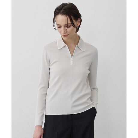 ■デザインハーフジップが新鮮な衿付きニットトップスです。衿端や袖口、裾に配色ラインを入れエッジをプラスしています。1枚はもちろん、ジャケットのインナーとして旬のスタイリングが叶います。またスカートやカジュアルなボトムとの合わせで休日にも活躍します。長袖ながら、さらっとした素材で長い時期活躍します。