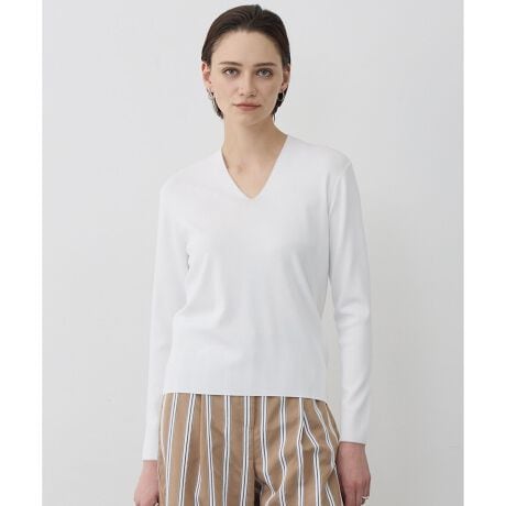 ■デザインネックラインがシャープで上品見えするVネックプルオーバーです。ジャケットINに着ていただいた際にバランス良く見える様な衿ラインに拘っています。衿端と袖口に入った繊細な配色ラインがポイント。ネイビー×ブラック(275)とトープ×オフホワイト(242)は衿端と袖口に加え、サイドと裾にICBらしい配色デザインをプラスしています。さらっとした着心地でON/OFF問わず長い時期活躍するニットアイテムです。