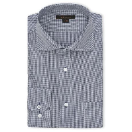 清潔感のある爽やかなチェック柄です。衿型はノータイでのオフィスカジュアルに最適なカッタウェイを採用。剣先が外に大きく開いていて、衿が目立たずスッキリとした印象です。