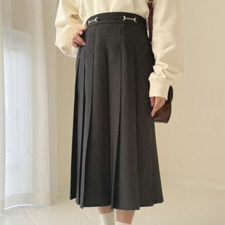 デニムライクな素材にビット使いが上品に効いたプリーツスカート。