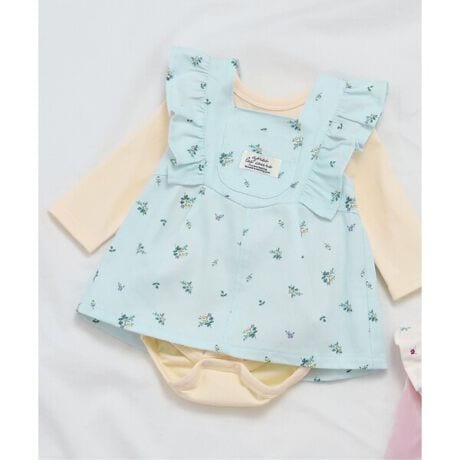 apres les cours(アプレレクール)の「小花柄肩フリルジャンスカ+ボディースーツセット」は、やさしいニュアンスのナチュラルなデザイン。ベビーギフトや出産祝いの主役にも♪