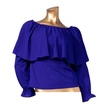 [型番:Y2K-6113-2026]ワイドなフリルカラーが目を惹くステージ用ブラウス。ストレッチ性のあるアムンゼン調の生地を使用し、上品さと動きやすさを兼ね備えています。背面シャーリングと脇ファスナーで着脱しやすいデザイン。襟周りには調整ゴムがありお好みでしぼりの調節が可能です。背面に向って幅が広がるフリルは優雅に揺れ、観る人の記憶に残るステージを演出します。