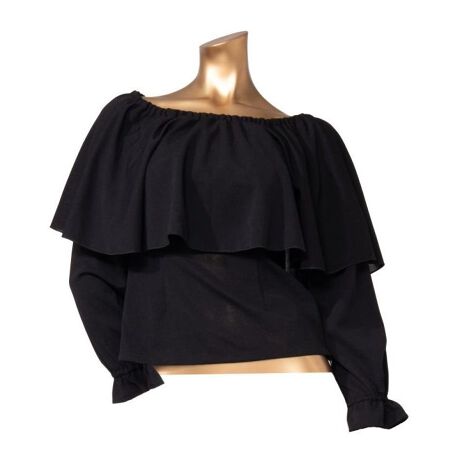 [型番:Y2K-6113-2026]ワイドなフリルカラーが目を惹くステージ用ブラウス。ストレッチ性のあるアムンゼン調の生地を使用し、上品さと動きやすさを兼ね備えています。背面シャーリングと脇ファスナーで着脱しやすいデザイン。襟周りには調整ゴムがありお好みでしぼりの調節が可能です。背面に向って幅が広がるフリルは優雅に揺れ、観る人の記憶に残るステージを演出します。