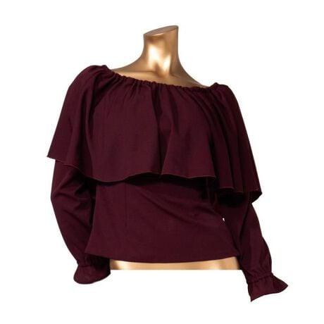 [型番:Y2K-6113-2026]ワイドなフリルカラーが目を惹くステージ用ブラウス。ストレッチ性のあるアムンゼン調の生地を使用し、上品さと動きやすさを兼ね備えています。背面シャーリングと脇ファスナーで着脱しやすいデザイン。襟周りには調整ゴムがありお好みでしぼりの調節が可能です。背面に向って幅が広がるフリルは優雅に揺れ、観る人の記憶に残るステージを演出します。