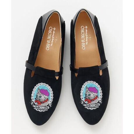 [型番:LCOP6115-2026]アンティークな猫のカメオを刺しゅうで表現した靴。ベレー帽をかぶった猫は欧州航路だけのオリジナルモチーフで、足元に遊び心と個性を添える一足です。