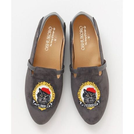 [型番:LCOP6115-2026]アンティークな猫のカメオを刺しゅうで表現した靴。ベレー帽をかぶった猫は欧州航路だけのオリジナルモチーフで、足元に遊び心と個性を添える一足です。