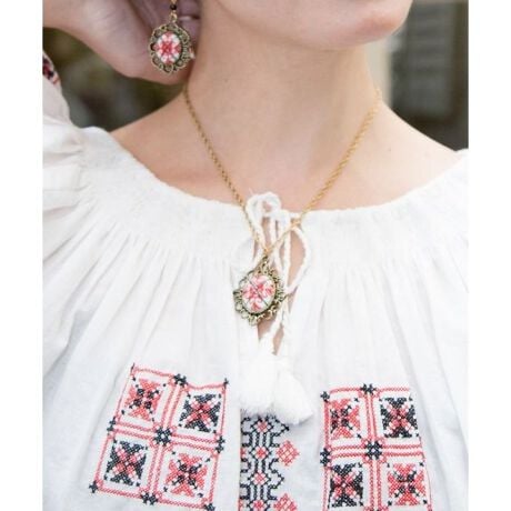 [型番:LIJZ6104-2026]刺しゅう柄が目を惹く、存在感あるロマニアネックレス。アンティーク調のフレームとモチーフが調和し、装いに華やかなアクセントを添えます。