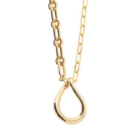 [型番:K1V23712__]<スタイリングに華やかさを加えるミックスチェーンネックレス>ふたつのチェーンを組み合わせた表情豊かなミックスチェーンネックレスです。デザインポイントのペンダントは細いチェーンの間で動く仕様になっています。ロングでの使用のほか、二重にして太さの異なるチェーンの重なりも楽しめます。着こなしに合わせて長さを調節して幅広いシーンで使い分けできます。パールネックレスなどレイヤードするスタイリングもおすすめです。