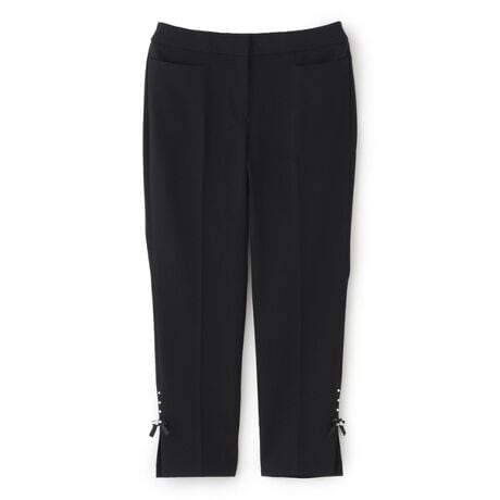 エレガントな印象と高い機能性を兼ね備えた素材です。淡い色でも透けにくく、ご家庭でのお洗濯後も乾きが早いのが特徴です。表面にはトリアセテート特有の上品な艶感があり、カジュアルになりすぎず、きれいめな印象を保ちます。横方向にストレッチ性があるため、着用時の動きを妨げず、快適にお召しいただけます。【デザイン・コーディネートポイント】定番の細身シルエットにセンタープレスを施した、洗練された印象のパンツです。裾にはラインストーンと、サテンリボンに重ねたビジューを配し、控えめな華やかさを添えました。リボンモチーフは取り外し可能なため、シーンやスタイリングに合わせて表情を変えていただけます。