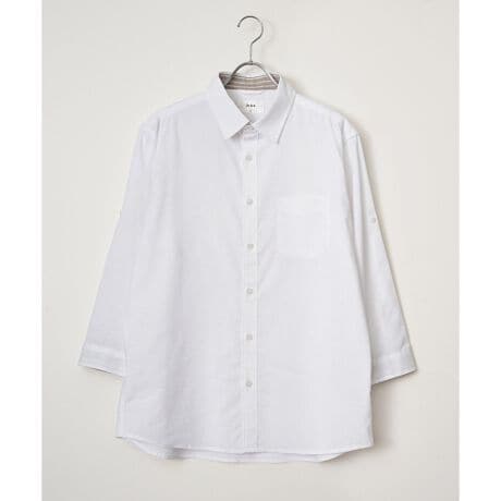 速乾性とイージーケア加工が施された、お手入れが楽な7分袖レギュラーカラーリネン無地シャツ。