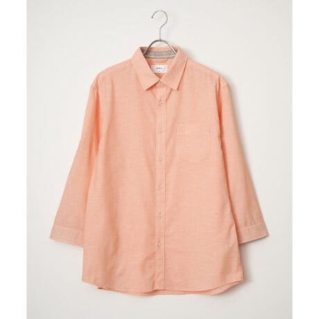 速乾性とイージーケア加工が施された、お手入れが楽な7分袖レギュラーカラーリネン無地シャツ。