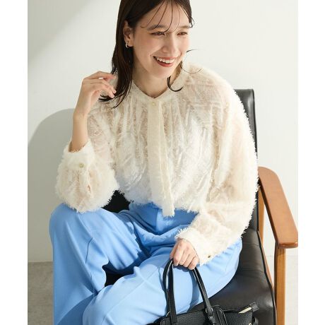 ダイヤ柄のようなモチーフにフサフサと毛足の長いアクセントをつけた素材感が目を惹くデザインブラウス。取り外しのできるボウタイ付きで、アレンジ次第で幅広い着こなしが完成します。ネックラインにタックを施し、ふんわり広がる女性らしいシルエットも魅力。首元や袖口のメタルボタンがさりげなく華やかな雰囲気をプラスします。透け感[ややあり]