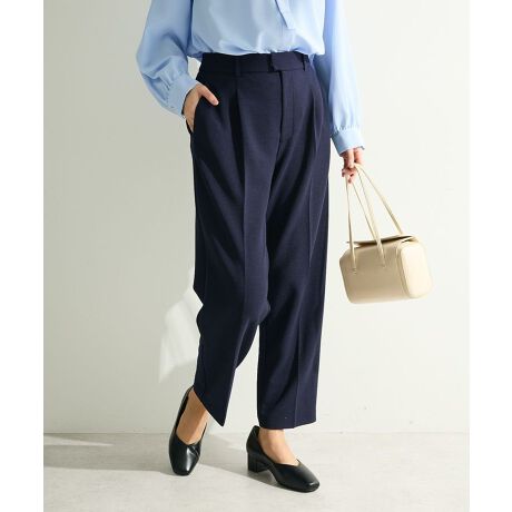 ストレッチ性のあるツイル調素材で仕立てたテーパードパンツ。フロントタックでゆとりのある腰周りに、センタープレスを施したきれいなシルエットが特徴です。ウエストバックゴム仕様でソフトフィットな穿き心地も嬉しいポイント。どんなトップスも着合せやすく、カジュアルからオケージョンまで幅広いシーンで活躍するおすすめのアイテムです。ご家庭でお手入れ可能。透け感[なし]