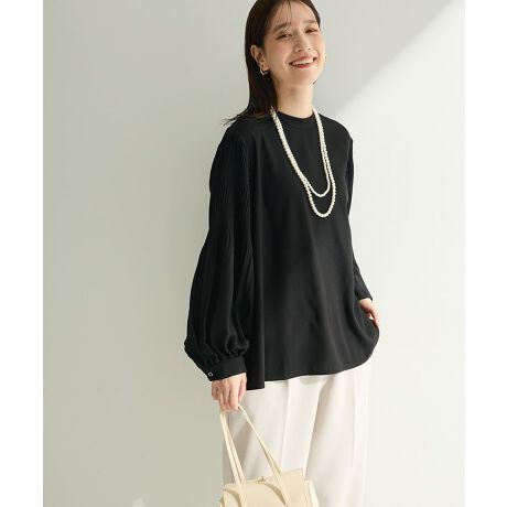 袖に施したプリーツが女性らしさを演出するブラウス。甘くなりすぎないよう首元はすっきりとしたバンドカラー仕様で、幅広い着こなしにマッチするデザインに仕上げました。ややフレアなシルエットで着心地よく、華奢見えが叶うのもポイント。合わせ方次第で普段使いからセレモニーシーンまで活躍するおすすめのアイテムです。透け感[ややあり]