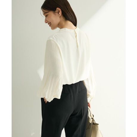 袖に施したプリーツが女性らしさを演出するブラウス。甘くなりすぎないよう首元はすっきりとしたバンドカラー仕様で、幅広い着こなしにマッチするデザインに仕上げました。ややフレアなシルエットで着心地よく、華奢見えが叶うのもポイント。合わせ方次第で普段使いからセレモニーシーンまで活躍するおすすめのアイテムです。透け感[ややあり]