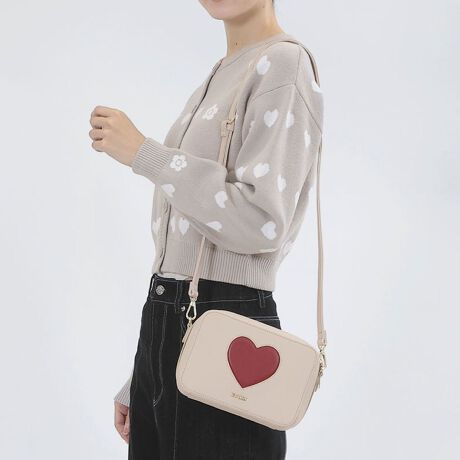 ハートが目を引く、スクエア型のショルダーバッグ。◆ポイント・本体は角シボ合皮を使用・ハート部分のスムース合皮が浮き出たデザイン・ロゴの切文字金具をON・間口はササマチ付きで大きく開くファスナー仕様・取り外せるショルダーベルトは長さ5段階調節可能なバックルタイプ内側:ポケット×1[型番:225-814110]