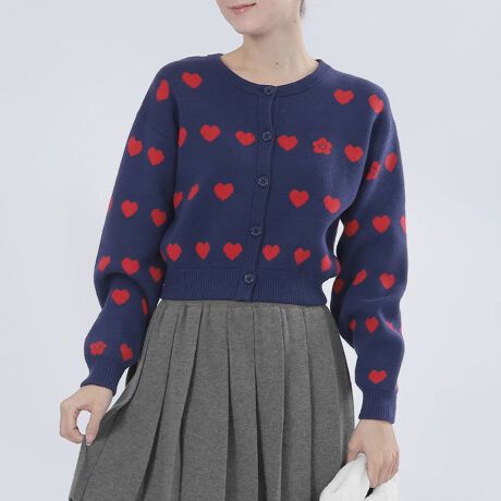 ハート総柄のニット・カーディガン。◆ポイント・ハートの中にさり気なくデイジー!・FRONTボタン開き・長袖◆コーディネートフェミニンなコーデにおすすめです。[型番:225-704820]