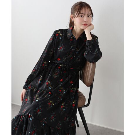 クラシカルな花柄が目を惹く、襟付きティアードワンピース