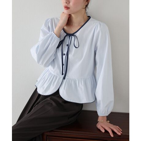 さりげなくキュートな魅力を詰め込んだバイカラーリボンペプラムブラウス