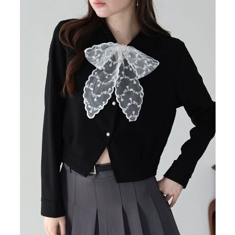 お顔周りに華やかさを添えるレースリボンと、気品溢れるパールボタンが目を惹くカーディガン。