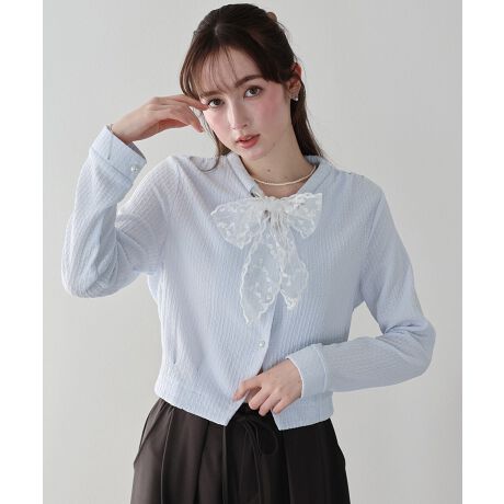 お顔周りに華やかさを添えるレースリボンと、気品溢れるパールボタンが目を惹くカーディガン。