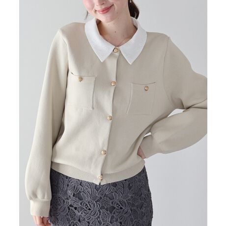 クラシカルな金ボタンがアクセントのニットカーディガンに、繊細なレースを重ねた襟をプラスした気品溢れる一着。