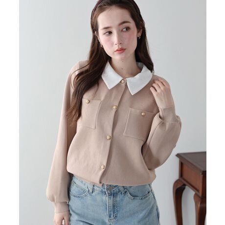 クラシカルな金ボタンがアクセントのニットカーディガンに、繊細なレースを重ねた襟をプラスした気品溢れる一着。