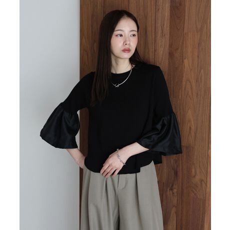 身頃にはしなやかなリブニット、袖部分にはほどよく光沢感のあるシャンタン生地をドッキングした、テクニックいらずのデザインプルオーバー。